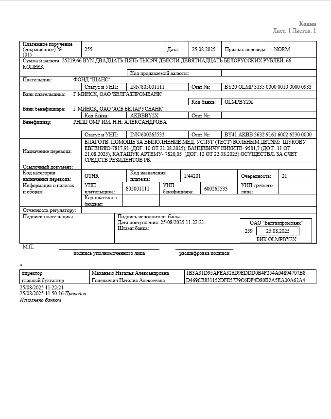 Я, Каташук Ольга Владимировна, мама Каташука Артема Руслановича 17.10.2017 года рождения. Моему сыну 7 лет. В июне 2025 года моему ребенку был поставлен диагноз «диффузная высокозлокачественная глиальная опухоль педиатрического типа». На данный момент мой сын проходит лечение в РНПЦ детской онкологии, гематологии и иммунологии. Моему ребенку выдали удостоверение инвалидности в июле 2025 года и поставили 4 СУЗ. Для более эффективного лечения моего сына нам показано комплексное геномное профилирование опухоли.