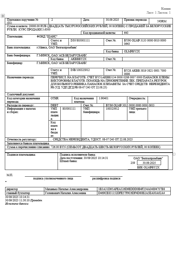 В ноябре - декабре 2022 года фонд "Шанс" оказал нам очень большую материальную помощь в приобретении препарата "Амфолип", с помощью которого удалось спасти жизнь моей дочери, Панасюк Елизаветы. На тот момент она находилась в реанимации с грибковой пневмонией. А так как после тотального облучения в сентябре 2022 года у нее был полностью убит костный мозг, собственные защитные силы были истощены и состояние было критическим. Но слава Богу, 20 декабря 2022 года, после лечения "Амфолипом" удалось-таки провести трансплантацию костного мозга. Это дата для Лизы - ее второй день рождения.