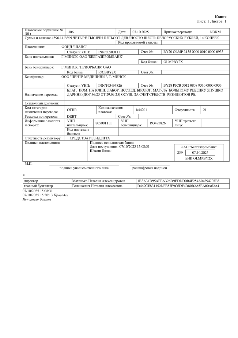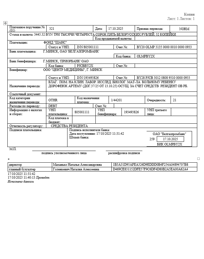 На счет ООО «ЦЕНТР МЕДИЦИНЫ» перечислены средства в размере 18 384,56 бел. руб. за выполнение клинического лабораторного исследования биологического материала для Миланы Олесиюк, Семёна Сугакова, Марии Дайлидёнок, Артёма Ильина.