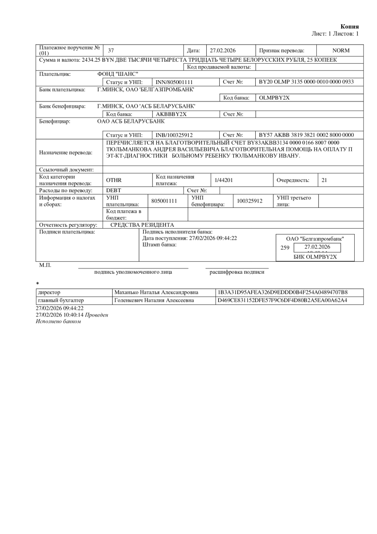 Если Вы не согласны с перенаправлением Вашего адресного пожертвования для Тюльманкова Ивана, Вы можете в течение 14 дней направить директору Фонда по электронной почте dir@chance.by заявление о возврате Вашего пожертвования, указав при этом Ваши полные фамилию, имя, отчество, банковские реквизиты, куда произвести возврат денег. Кроме того, в заявлении необходимо указать дату, время проведения платежа, код авторизации, номер операции (RRN) и сумму пожертвования.