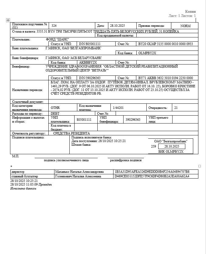 Отдельная благодарность коллективу центра. Дружно и со знанием дела организовать процесс реабилитации - дорогого стоит. Благодарю за возможность оздоровления моей дочери и фонд. Четкость в каждом шаге: от условий участия в программе, до сроков отчётности. Поддержка и понимание во всем, что делаете.