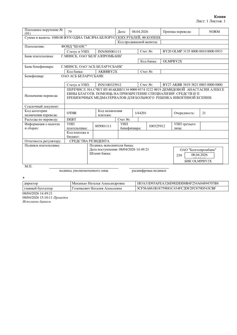 Хочется выразить в очередной раз огромную благодарность всему коллективу Фонда "Шанс" и всем благотворителям.
