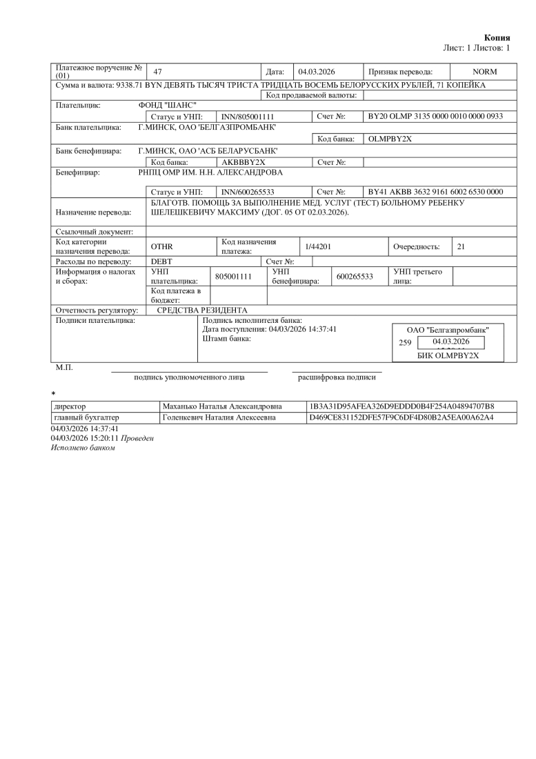 С 07.11.2025 у ребёнка стала повышаться температура тела. 11.11.25 гематому вскрыли, т.к. она стала нагнаиваться. Выписали нас 03.12.2025 с диагнозом "нагнаивающаяся гематома правой голени, флегмона мягких тканей". Почти целый месяц мы ходили на перевязки. Из небольшого надреза у ребёнка выходили сгустки крови, образование стало немного меньше после этих процедур, но к концу месяца стало всё наливаться кровью. 29.12.25 мы поехали на УЗИ, диагноз – флегмона мягких тканей правой голени. В этот же день нас положили в детскую больницу г.Гродно. Нам в стационаре сделали КТ с контрастом. В результате исследования нам поставили диагноз "аневризма". На машине скорой помощи нас доставили в РНПЦ детской хирургии г.Минска. Оттуда врачи нас отправили на консультацию к врачу онкологу в РНПЦ ДОГИ. 31.12.2025 нам сказали, что мы их пациент. Очень не хотелось это услышать накануне праздника. На Новый год нас отпустили домой. 04.01.2026 года мы легли, а 05.01.202 у Максима взяли биопсию. Через неделю нам поставили диагноз "саркома с альтерациями гена BCOR". Начали химиотерапию. Для лучшего и дальнейшего лечения врачи рекомендуют сделать FMI-тест. Я очень прошу у Вас помощи в оплате этого исследования.