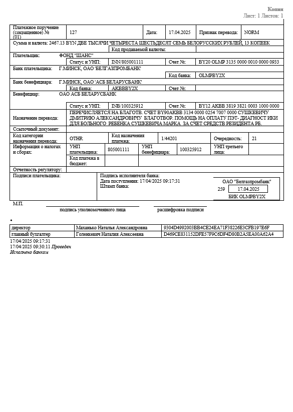 У Марка низкодифференцированная нейробластома заднего средостения. Ребёнок с 2024 года проходит лечение согласно протоколу на базе ГУ «РНПЦ детской онкологии, гематологии и иммунологии». На данном этапе для оценки распространенности остаточного процесса Марку показано выполнение ПЭТ-диагностики. Учитывая невозможность проведения данного метода диагностики в Республике Беларусь, мальчику рекомендовано выполнение ПЭТ-диагностики в Российской Федерации. Помощь Марку оказана в рамках программы «Шанс».
