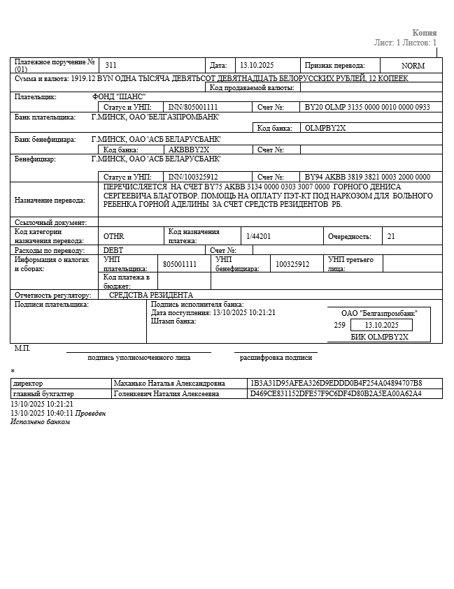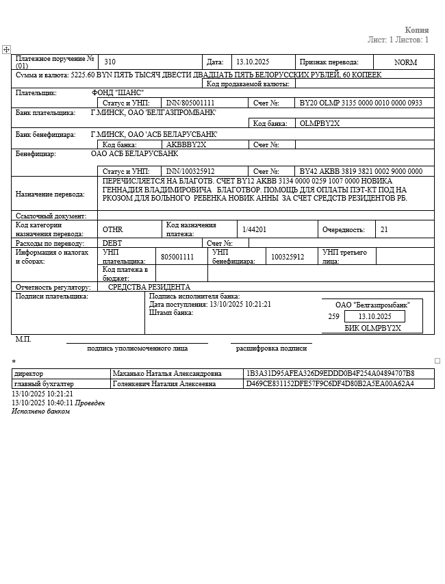 На благотворительный счет Новика Геннадия Владимировича перечислена благотворительная помощь в размере 5 225,60 бел.руб. на оплату ПЭТ-диагностики с наркозом для дочери Новик Анны. Необходимая сумма собрана в рамках кампании «Помощь без промедления».