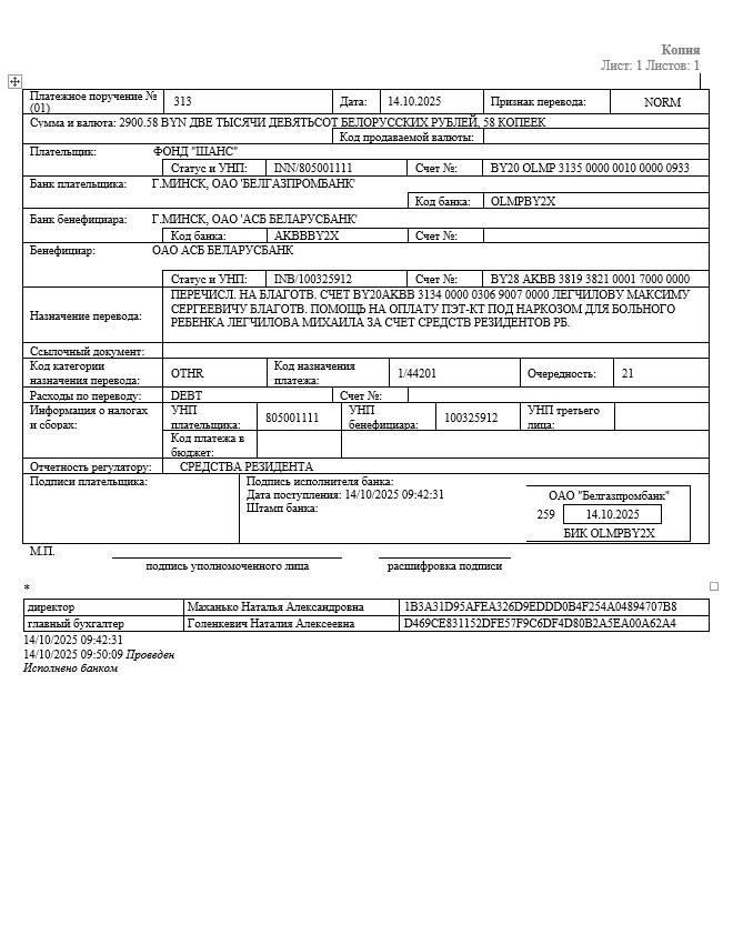 На благотворительный счет Легчилову Максиму Сергеевичу перечислена благотворительная помощь в размере 2 900,58 бел.руб. на оплату ПЭТ-диагностики с наркозом для сына Легчилова Михаила. Необходимая сумма собрана в рамках кампании «Помощь без промедления».