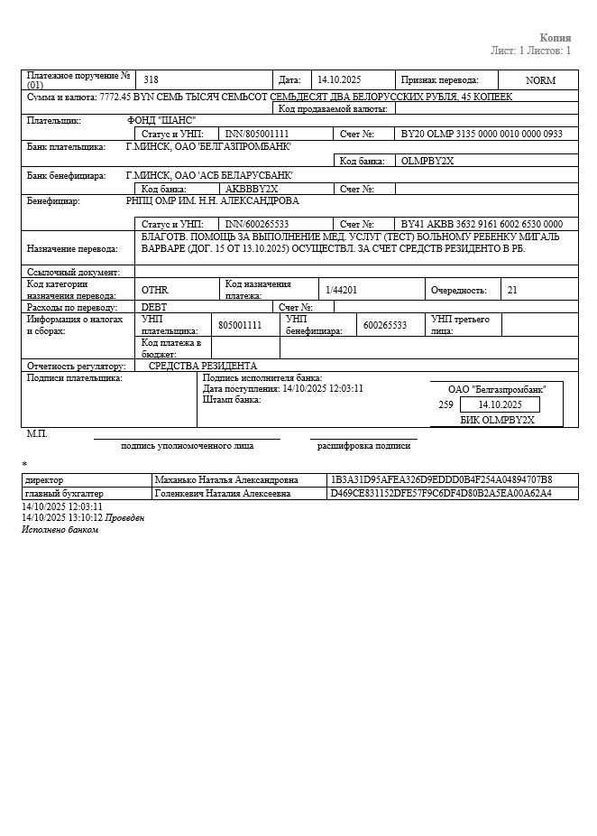 Благодарим ваш Фонд за поддержку и помощь нуждающимся деткам! Надеемся и искренне верим, что нашей девочки Варечки будет шанс на выздоровление благодаря вашей поддержке!